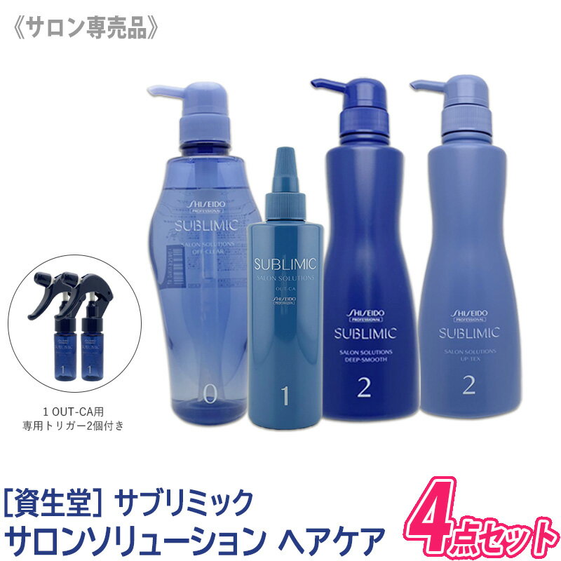 商品名サブリミック サロンソリューション ヘアケア 4種セット(専用トリガー付)商品区分化粧品内容量・0 オフ・クリア (シャンプー):500ml・1 アウト CA h(トリートメント):250ml・2 アップ・テックス (トリートメント):500g・2 ディープスムース (トリートメント):500g用途シャンプー/ヘアトリートメント成分表示0 オフ・クリア水、ココイルメチルタウリンNa、コカミド...
